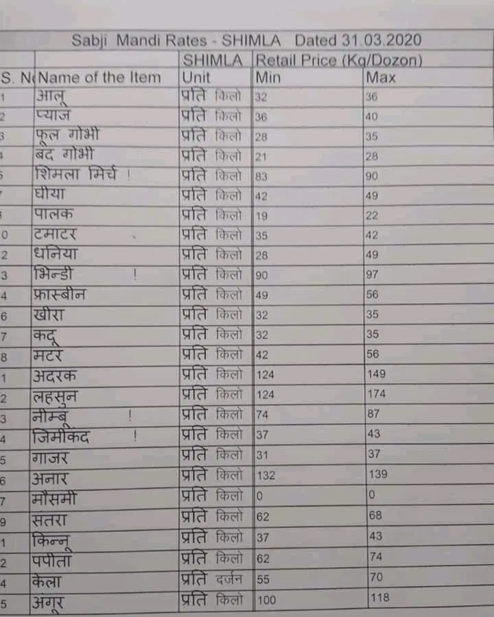 शिमला में 31 मार्च 2020 के फल व सब्जियों के दामों की लिस्ट जारी की गई है । शिमला में फलों व सब्जियों के दाम अधिक बसूलने की शिकायतो के चलते शिमला में फल व सब्जियों के दाम तय कर दिए है । शिमला में 31 मार्च 2020 को फल- सब्जियों के दाम ये रहेंगे ! तय दामों से अधिक बसूलने वालों के खिलाफ होगी कार्यवाही !