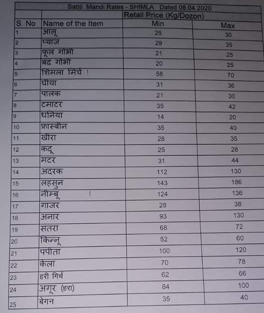 शिमला ! सब्जी मंडी द्वारा रोजाना फल और सब्जियों के दाम की लिस्ट जारी की जाती है ताकि दुकानदारों द्वारा फल और सब्जियों के अधिक दाम न बसूले जाये ! आज 08 अप्रैल 2020 के फल और सब्जियों के दाम की लिस्ट भी जारी की गई है ! अधिक दाम बसूलने वाले दुकानदारों के खिलाफ प्रशाशन कार्यवाही करेगा ! इसी कड़ी में पिछले कल 07 अप्रैल 2020 को शिमला में 8 फल और सब्जी बिक्रेताओं के चालान काटे गए है !