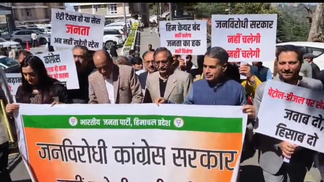 शिमला ! एंट्री टैक्स को लेकर बवाल, तख्तियां बैनर लेकर अभी पक्ष का विधानसभा परिसर में धरना प्रदर्शन !