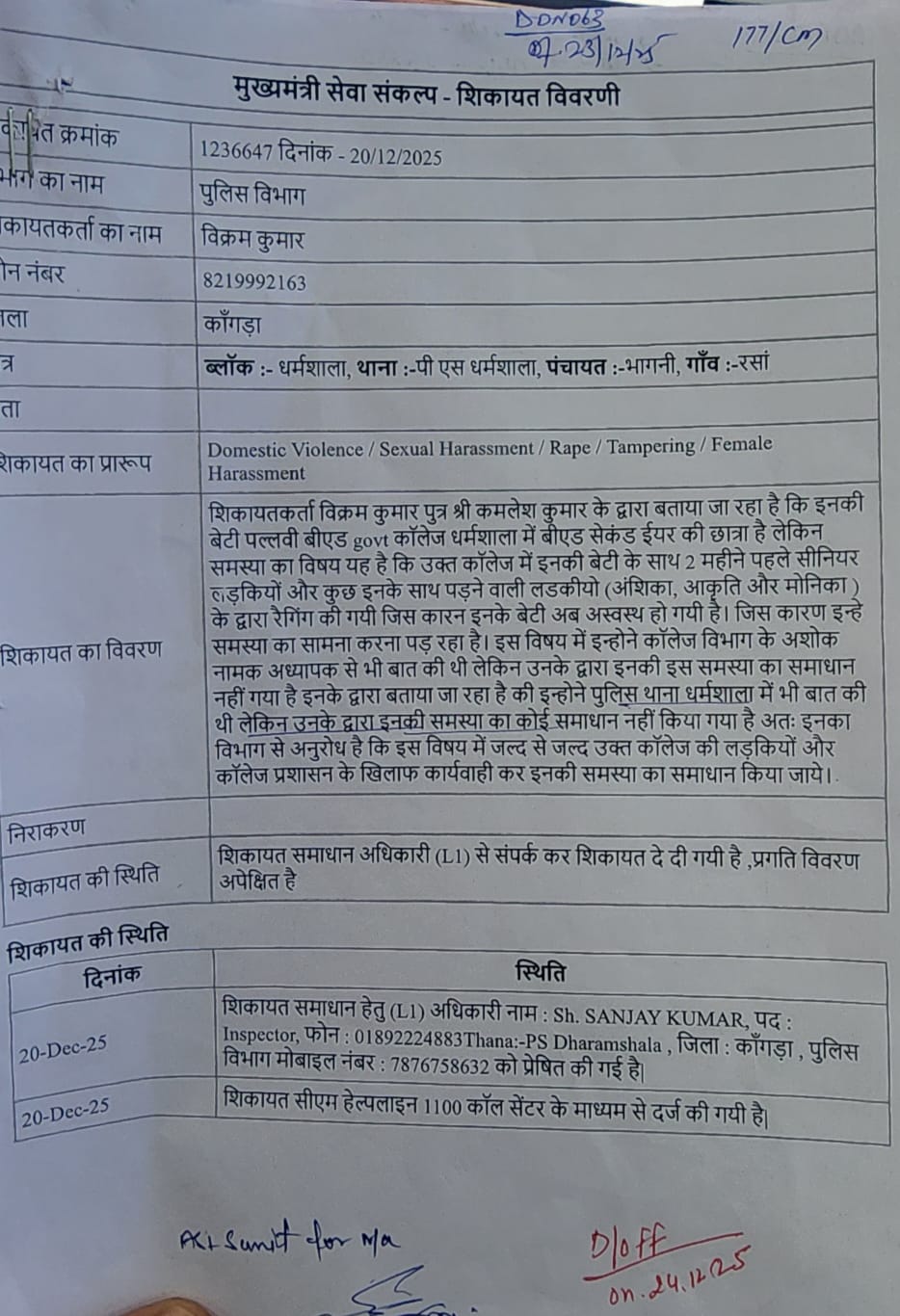 यह एफआईआर विक्रम कुमार पुत्र स्व. कमलेश कुमार, निवासी गांव रसना टपोवन, वार्ड नंबर-09, डाकघर सिद्धबाड़ी, तहसील धर्मशाला, जिला कांगड़ा (हि.प्र.) द्वारा दर्ज करवाई गई है। शिकायतकर्ता ने बताया कि उनकी 19 वर्षीय पुत्री पल्लवी, जो धर्मशाला के एक डिग्री कॉलेज में द्वितीय वर्ष की छात्रा थी, को दिनांक 18 सितंबर 2025 को कॉलेज की छात्राओं हर्षिता, आकृति एवं कोमोलिका द्वारा कथित रूप से मारपीट कर मानसिक रूप से प्रताड़ित किया गया।