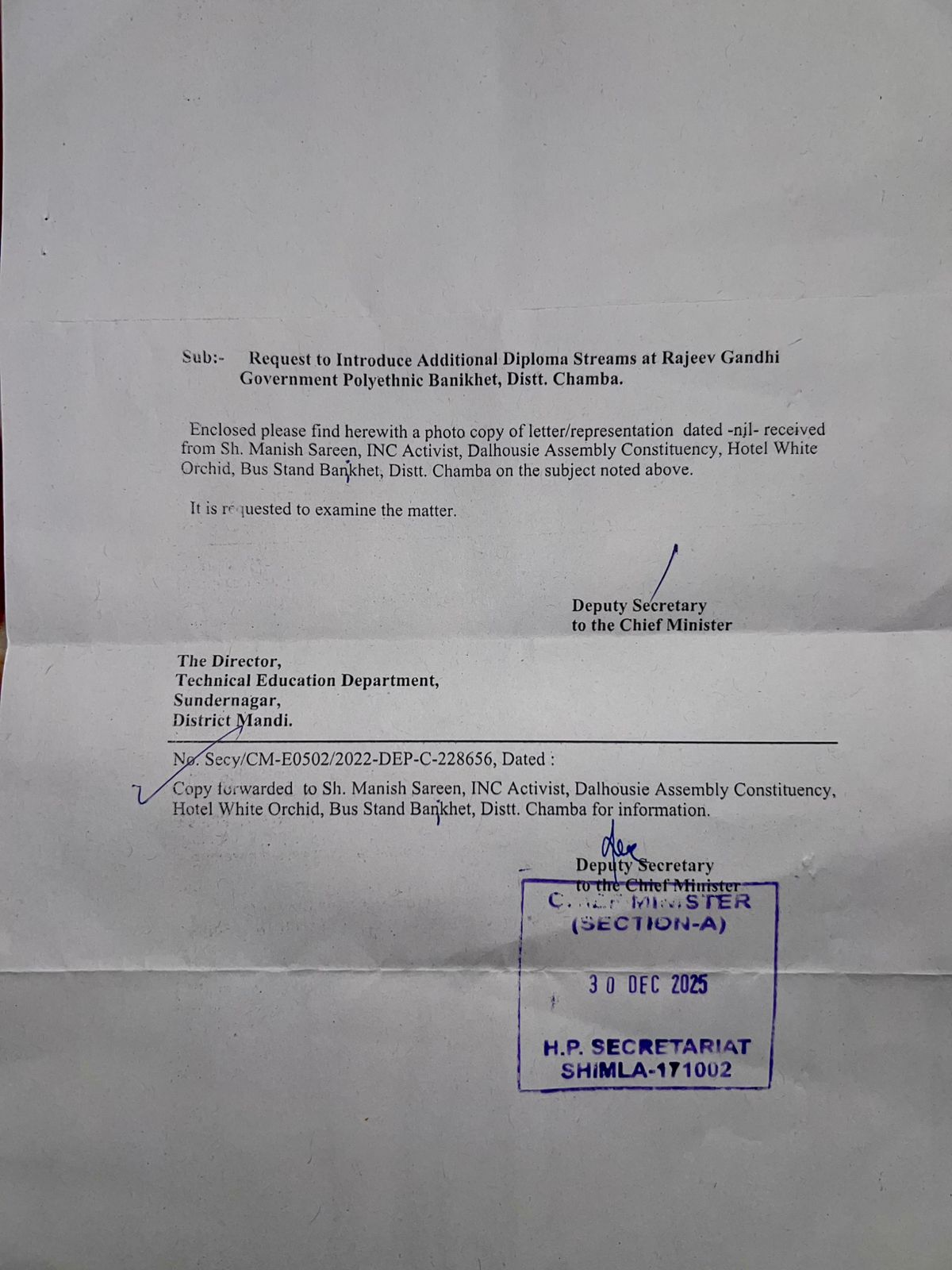 चम्बा , 17 जनवरी [ शिवानी ] ! राजीव गांधी राजकीय पॉलिटेक्निक, बनीखेत जिला चम्बा में अतिरिक्त डिप्लोमा स्ट्रीम्स शुरू करने संबंधी मेरे निवेदन पर माननीय मुख्यमंत्री कार्यालय द्वारा संज्ञान लेते हुए तकनीकी शिक्षा विभाग को परीक्षण हेतु भेजा जाना, यह दर्शाता है कि वर्तमान सरकार शिक्षा, युवाओं और दूरदराज़ क्षेत्रों के विकास को लेकर कितनी संवेदनशील और गंभीर है।