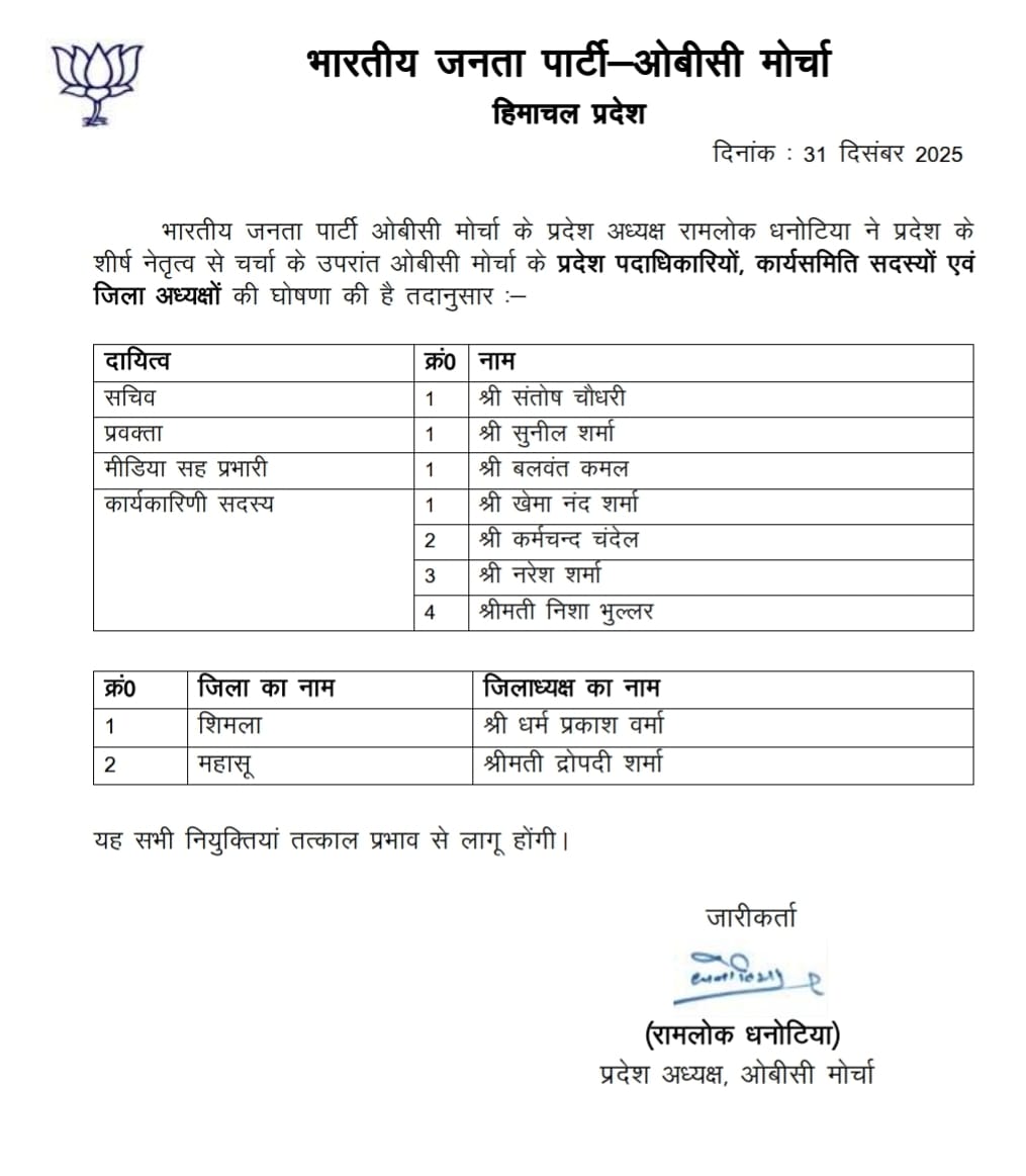शिमला ! भाजपा ने मोर्चा संगठनों का विस्तार किया, अनुसूचित जाति, ओबीसी और अनुसूचित जनजाति मोर्चों की प्रदेश कार्यकारिणी घोषित !