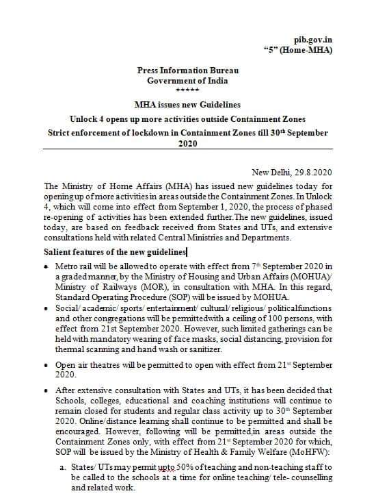 केंद्र सरकार ने अनलॉक 4 की गाइडलाइन जारी कर दी है ।