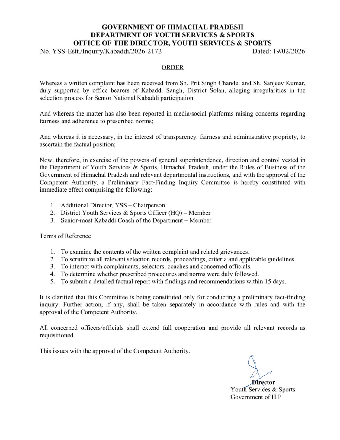 शिमला , 19 फरवरी [ विशाल सूद ] ! हिमाचल प्रदेश के युवा सेवा एवं खेल मंत्री यादविंदर गोमा के आदेश पर विभाग ने सीनियर नेशनल कबड्डी प्रतियोगिता के लिए चयन प्रक्रिया में अनियमितताओं के आरोपों की जांच के लिए प्रारंभिक तथ्य-खोज समिति का गठन किया है। यह कदम प्रित सिंह चंदेल और संजीव कुमार की शिकायत के बाद उठाया गया है, जिसमें कबड्डी संघ के पदाधिकारियों ने चयन प्रक्रिया में गड़बड़ी का आरोप लगाया था। गठित की गई समिति में अतिरिक्त निदेशक, युवा सेवा एवं खेल (अध्यक्ष), जिला युवा सेवा एवं खेल अधिकारी (मुख्यालय) और विभाग के वरिष्ठ कबड्डी कोच शामिल हैं। समिति को 15 दिनों के भीतर जांच रिपोर्ट प्रस्तुत करने का निर्देश दिया गया है। यह समिति शिकायत और संबंधित आरोपों की जांच करेगी, जिसमें चयन प्रक्रिया के रिकॉर्ड और मानकों की समीक्षा की जाएगी। समिति शिकायतकर्ता, चयनकर्ताओं और अधिकारियों से बातचीत भी करेगी, ताकि निर्धारित प्रक्रियाओं का पालन जांचा जा सके। इसके बाद समिति तथ्यात्मक रिपोर्ट और सिफारिशें प्रस्तुत करेगी, जिसमें जांच के निष्कर्ष और आगे की कार्रवाई के लिए सुझाव शामिल होंगे।