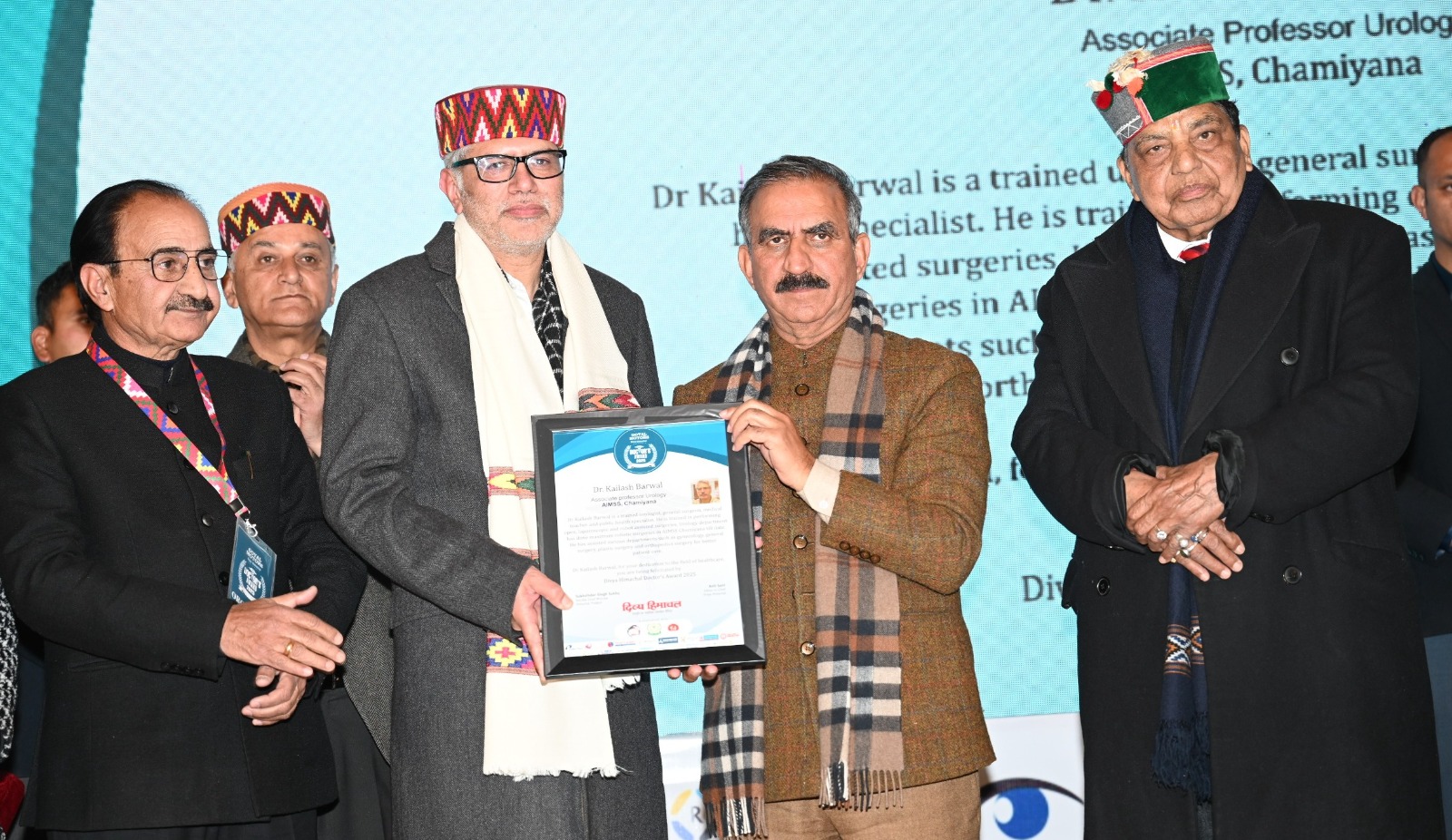 मुख्यमंत्री ने एचओडी नेफ्रोलॉजी एम्स बिलासपुर के प्रो. (डॉ.) संजय विक्रांत, अटल इंस्टीट्यूट ऑफ मेडिकल सुपर स्पेशियलिटीज शिमला के प्रिंसिपल, प्रोफेसर एवं प्रमुख प्रो. (डॉ.) बृज शर्मा, राष्ट्रीय आयुर्वेद संस्थान जयपुर के कुलपति प्रो. संजीव शर्मा, एआईएमएसएस चमियाना के प्रोफेसर एवं प्रमुख न्यूरोलॉजी डॉ. सुधीर शर्मा, आईजीएमसी शिमला के रूमेटोलॉजिस्ट (मेडिसिन विभाग) के डॉ. विकास शर्मा, एआईएमएसएस चमियाना के एसोसिएट प्रोफेसर यूरोलॉजी डॉ. कैलाश बरवाल, पंडित जवाहर लाल नेहरू राजकीय चिकित्सा महाविद्यालय चंबा के एचओडी ऑर्थोपेडिक्स डॉ. मणिक सहगल, टांडा के न्यूरोसर्जन (ब्रेन एवं स्पाइन विशेषज्ञ) डॉ. मुकेश कुमार, टांडा के सहायक प्रोफेसर रीनल ट्रांसप्लांट सर्जरी डॉ. अमित शर्मा, जोनल अस्पताल मंडी के मेडिकल ऑफिसर स्पेशलिस्ट (ऑर्थोपेडिक्स) डॉ. वीरेंद्र नेगी, जोनल अस्पताल मंडी के मेडिकल ऑफिसर स्पेशलिस्ट (ओबीजी) डॉ. वरुण कपूर, जोनल अस्पताल मंडी के मेडिकल ऑफिसर स्पेशलिस्ट (जनरल सर्जरी) डॉ. दीपक ठाकुर, क्षेत्रीय अस्पताल रिकांगपिओ, किन्नौर के मेडिकल ऑफिसर स्पेशलिस्ट (जनरल सर्जरी) डॉ. भारतेन्दु नागेश, अभिनम आई केयर सेंटर सोलन के विशेषज्ञ डॉ. अभिराज कुमार को उनकी निःस्वार्थ एवं असाधारण स्वास्थ्य सेवाओं के लिए सम्मानित किया गया। इसके अतिरिक्त पीजीआईएमईआर चंडीगढ़ में रोगी-केंद्रित स्वास्थ्य सेवाओं को आगे बढ़ाने में दूरदर्शी नेतृत्व के लिए उप निदेशक (प्रशासन) पंकज राय को भी सम्मानित किया गया।