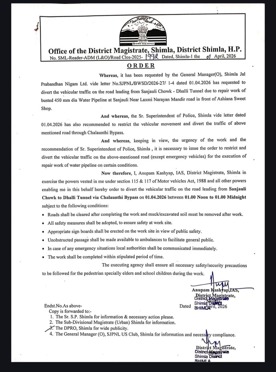 शिमला , 01 अप्रैल [ विशाल सूद ] ! जिला दण्डाधिकारी शिमला अनुपम कश्यप ने संजौली चौक से ढली टनल तक मार्ग को 01 अप्रैल 2026 को दोपहर 1 बजे से मध्यरात्रि 1 बजे तक बंद करने के आदेश जारी किए हैं ताकि संजौली में लक्ष्मी नारायण मंदिर के समीप आशियाना स्वीट शॉप के सामने टूटी हुई पानी की पाइप की मरम्मत की जा सके।