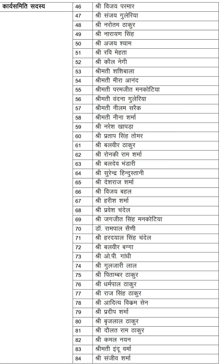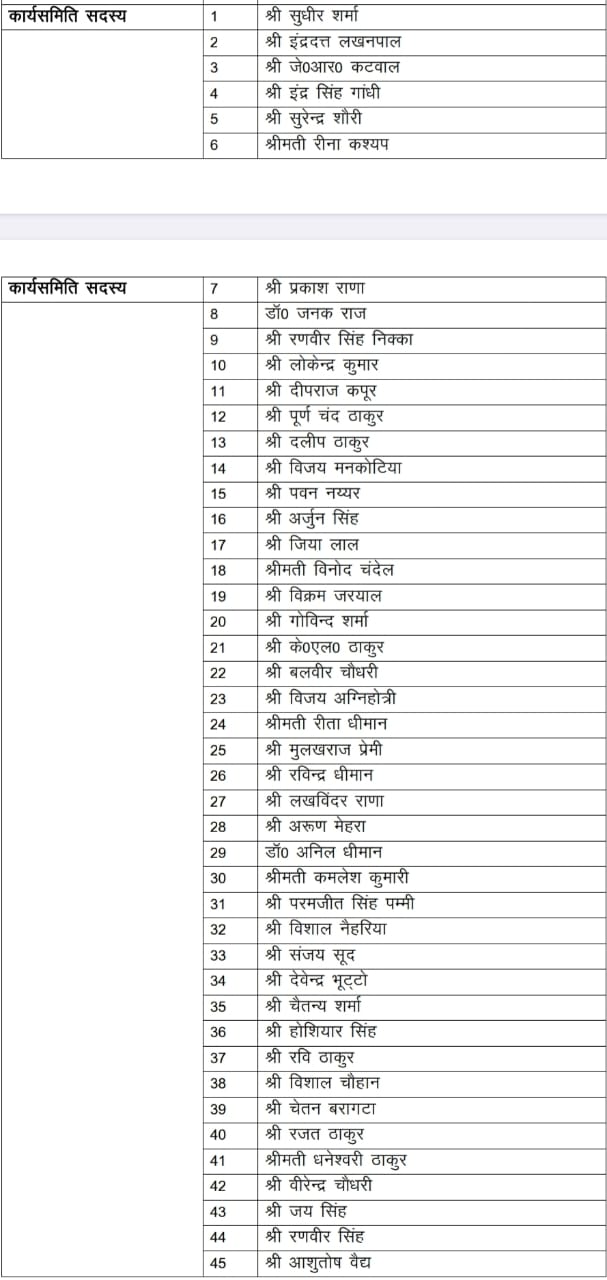 इसी प्रकार कार्यसमिति सदस्य विधायक सुधीर शर्मा, इंद्रदत्त लखनपाल, जे०आर० कटवाल, इंद्र सिंह गांधी, सुरेन्द्र शौरी, रीना कश्यप, प्रकाश राणा, डॉ० जनक राज, रणवीर सिंह निक्का, लोकेन्द्र कुमार, दीपराज कपूर, पूर्ण चंद ठाकुर, दलीप ठाकुर, विजय मनकोटिया, पवन नय्यर, अर्जुन सिंह, जिया लाल, विनोद चंदेल, विक्रम जरयाल, गोविन्द शर्मा, के०एल० ठाकुर, बलवीर चौधरी, विजय अग्निहोत्री, रीता धीमान, मुलखराज प्रेमी, रविन्द्र धीमान, लखविंदर राणा, अरूण मेहरा, डॉ० अनिल धीमान, कमलेश कुमारी, परमजीत सिंह पम्मी, विशाल नैहरिया, संजय सूद, देवेन्द्र भूट्टो, चैतन्य शर्मा, होशियार सिंह, रवि ठाकुर, विशाल चौहान, चेतन बरागटा, रजत ठाकुर, धनेश्वरी ठाकुर, वीरेन्द्र चौधरी, जय सिंह, रणवीर सिंह, आशुतोष वैद्य, विजय परमार, संजय गुलेरिया, नरोतम ठाकुर, नारायण सिंह, अजय श्याम, रवि मेहता, कौल नेगी, शशिबाला, मीरा आनंद, परमजीत मनकोटिया, वंदना गुलेरिया, नीलम सरैक, नीना शर्मा, नरेश खापड़ा, प्रताप सिंह तोमर, बलवीर ठाकुर, रोनकी राम शर्मा, बलदेव भंडारी, सुरेन्द्र हिन्दुस्तानी, देशराज शर्मा, विजय बहल, हरीश शर्मा, प्रवेश चंदेल, जगजीत सिंह मनकोटिया, डॉ. रामपाल सैणी, हरदयाल सिंह चंदेल, बलवीर बग्गा, ओ.पी. गांधी, गुलजारी लाल, पिताम्बर ठाकुर, धर्मपाल ठाकुर, राज सिंह ठाकुर, आदित्य विक्रम सेन, प्रदीप शर्मा, बृजलाल ठाकुर, दौलत राम ठाकुर, कमल नयन, इंदू वर्मा, संजीव शर्मा, राजेन्द्र ठाकुर, मोहम्मद राजबली, अनिल ढकोग, ओमप्रकाश चौधरी, विनय चौधरी, बिलाल अहमद, रमेश राणा, ब्रिगेडियर कुशाल चंद, सरदार बलजीत सिंह नागरा, राहुल सोलंकी, प्रदीप सूद, हुकम सिंह बैंस, शोभा डडवाल, धन्नो देवी, संजीव चौहान, जवाहर शर्मा, गायत्री कपूर, शीला देवी, अचल पठानिया, दर्शन सैणी और हरीश ठाकुर होंगे।