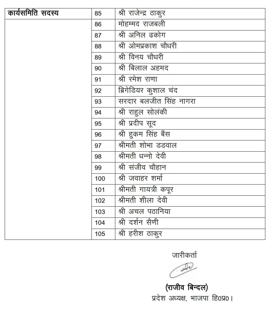 शिमला, 05 अक्टूबर [ विशाल सूद ] ! भाजपा प्रदेश अध्यक्ष डॉ राजीव बिंदल ने 129 सदस्यों की प्रदेश कार्यसमिति की घोषणा की जिसमें स्थाई आमंत्रित सदस्य 24 और कार्य समिति सदस्य 105 है।