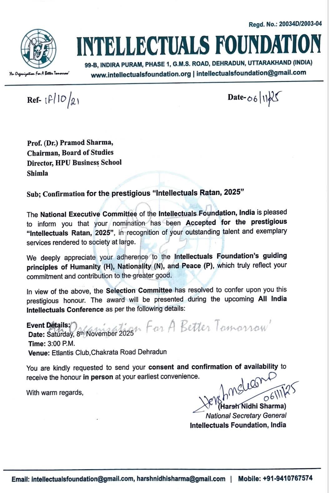 शिमला, 8 नवंबर [ विशाल सूद ] !इंटेलेक्चुअल फाउंडेशन ऑफ इंडिया द्वारा हिमाचल प्रदेश विश्वविद्यालय के बिजनेस मैनेजमेंट विभाग के निदेशक प्रोफेसर डॉ. प्रमोद शर्मा को वर्ष 2025 के “इंटेलेक्चुअल रत्न सम्मान” के लिए चयनित किया गया है।