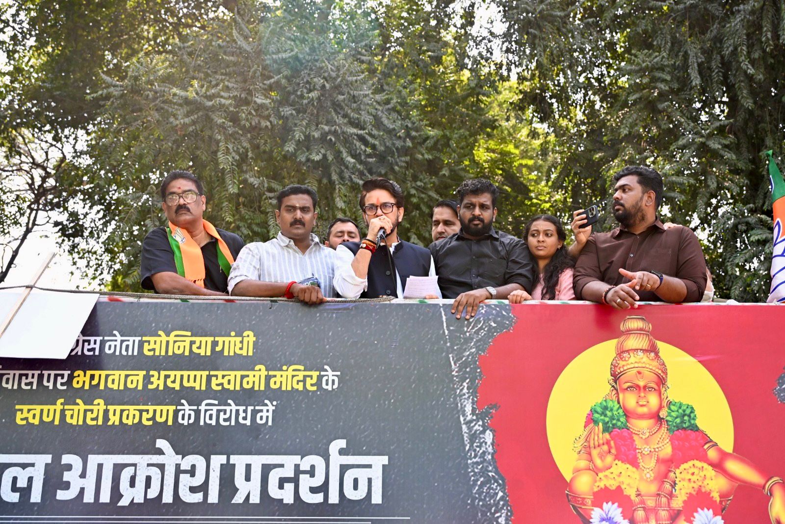 शिमला , 27 फरवरी [ विशाल सूद ] ! पूर्व केंद्रीय मंत्री व हमीरपुर लोकसभा क्षेत्र से सांसद श्री अनुराग सिंह ठाकुर के नेतृत्व में भारतीय जनता पार्टी, केरलम ईकाई ने दिल्ली में सबरीमाला मंदिर में सोना चोरी मामले को लेकर कांग्रेस की वरिष्ठ नेता श्रीमती सोनिया गांधी के खिलाफ जोरदार प्रदर्शन कर सोनिया गांधी और स्वर्ण लूट के कुख्यात सरगना उन्नीकृष्णन पोट्टी के बीच संबंधों के खुलासे व सबरीमाला स्वर्ण लूट की जांच की जद में सोनिया गांधी को भी सम्मिलित करने की माँग की।